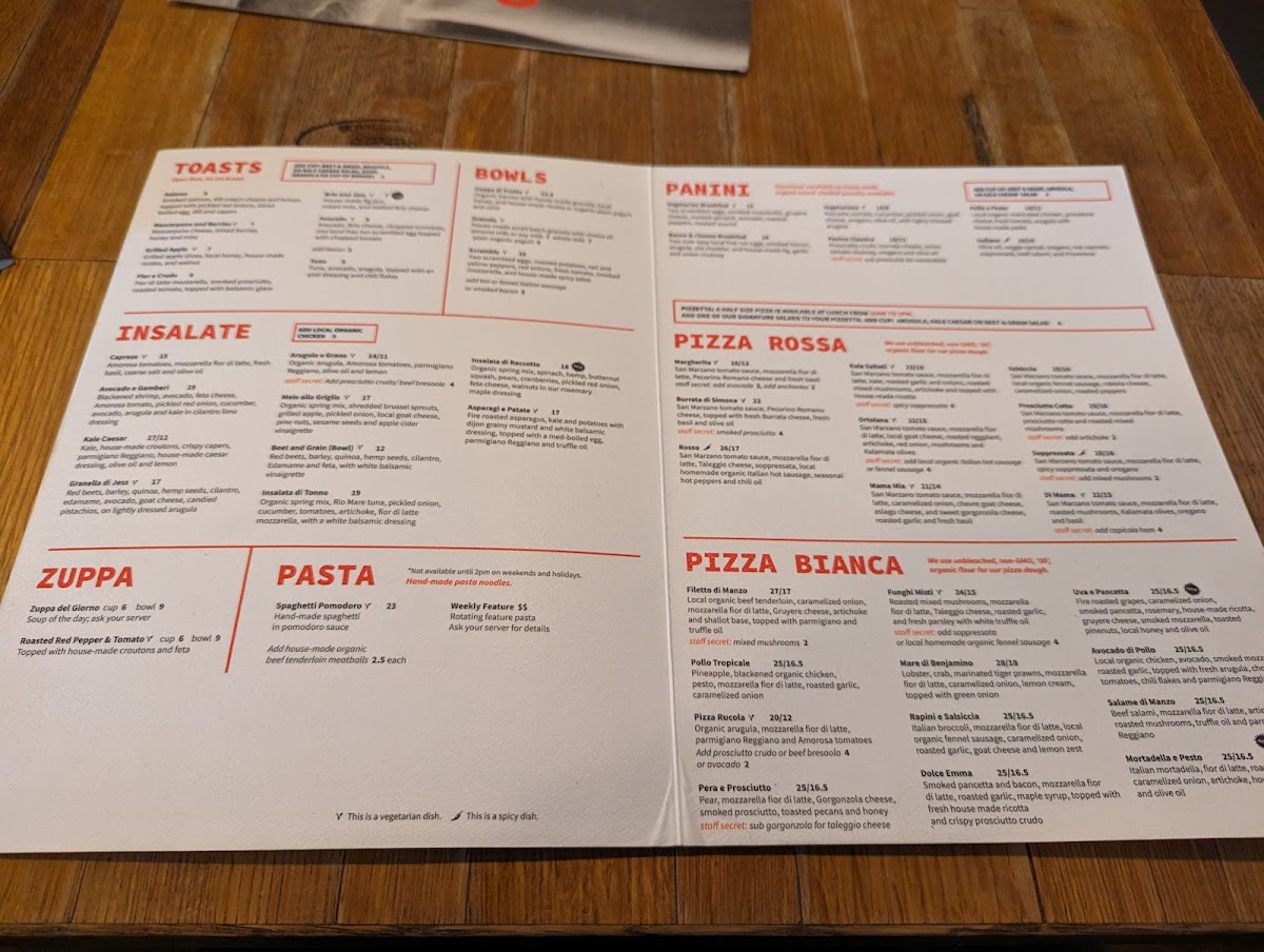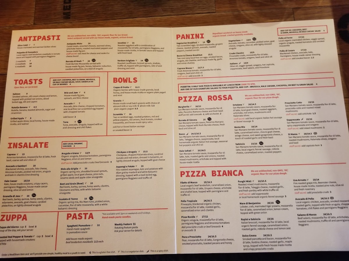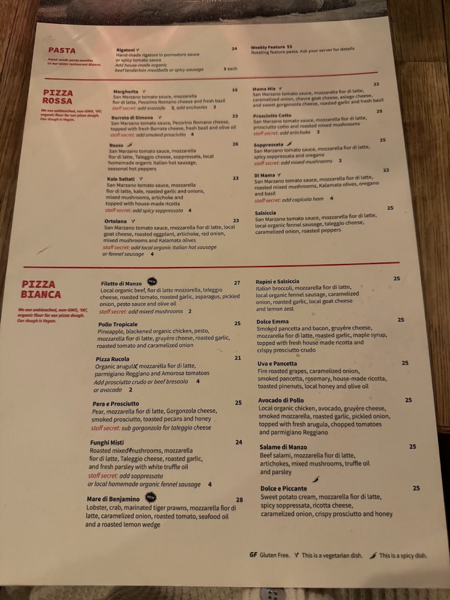 Ordered Rosso and dolce Emma. Really liked both. The dough is fantastic. My favorite was Dolce Emma perfect balance. Atmosphere is great. Nice decor. Service was fantastic. Would I come back? Absolutely.